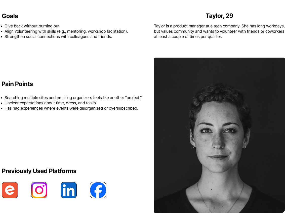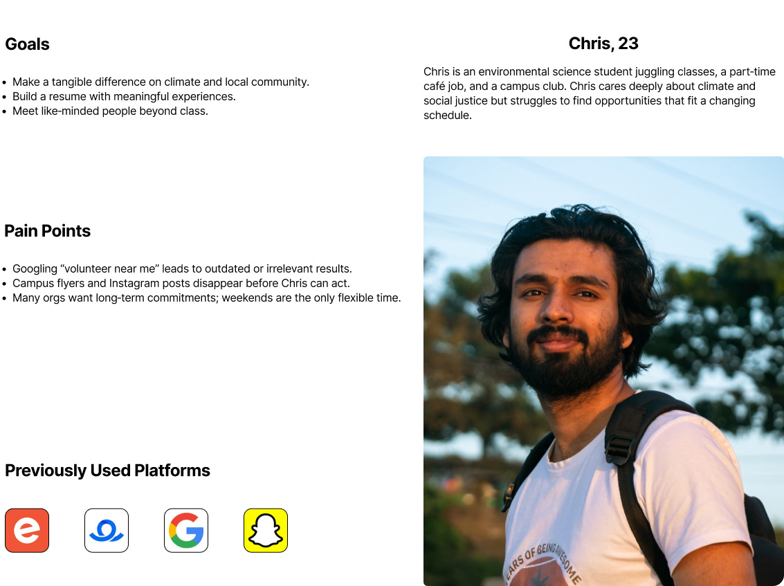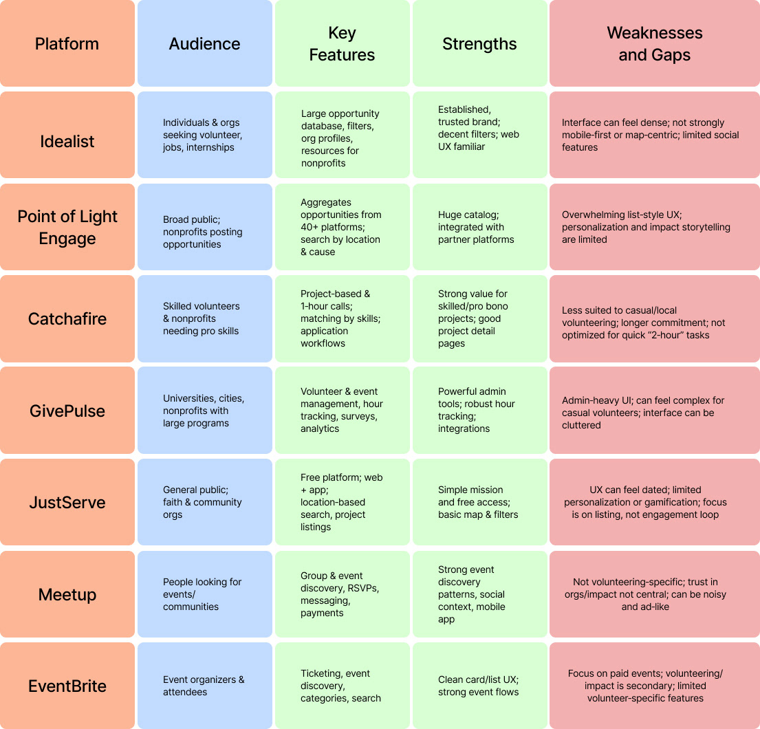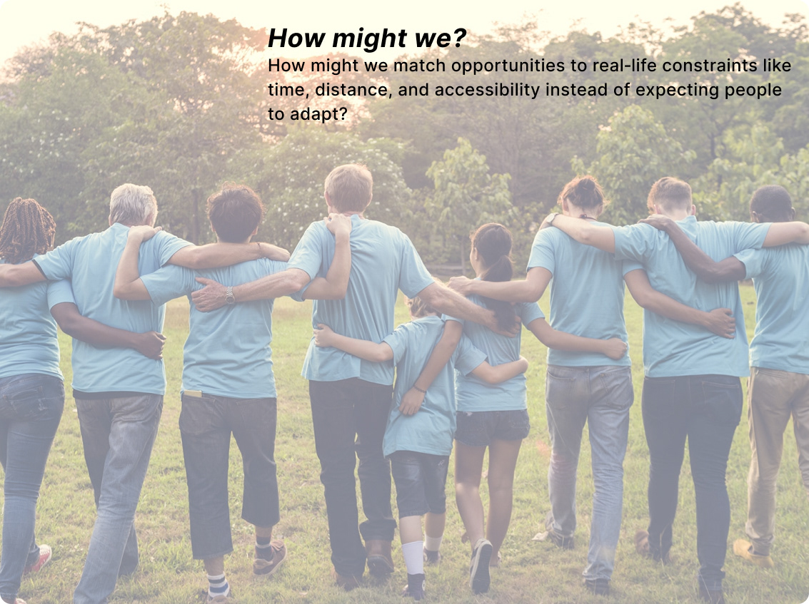 Volunteers struggle to find suitable roles due to fragmented information, creating a high‑friction process that leads to drop‑offs. Nonprofits, in turn, face unreliable support and unfilled roles.