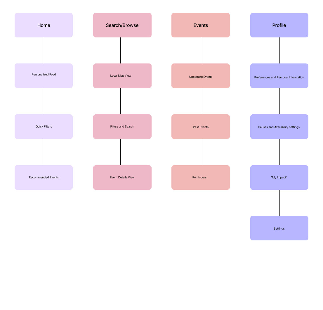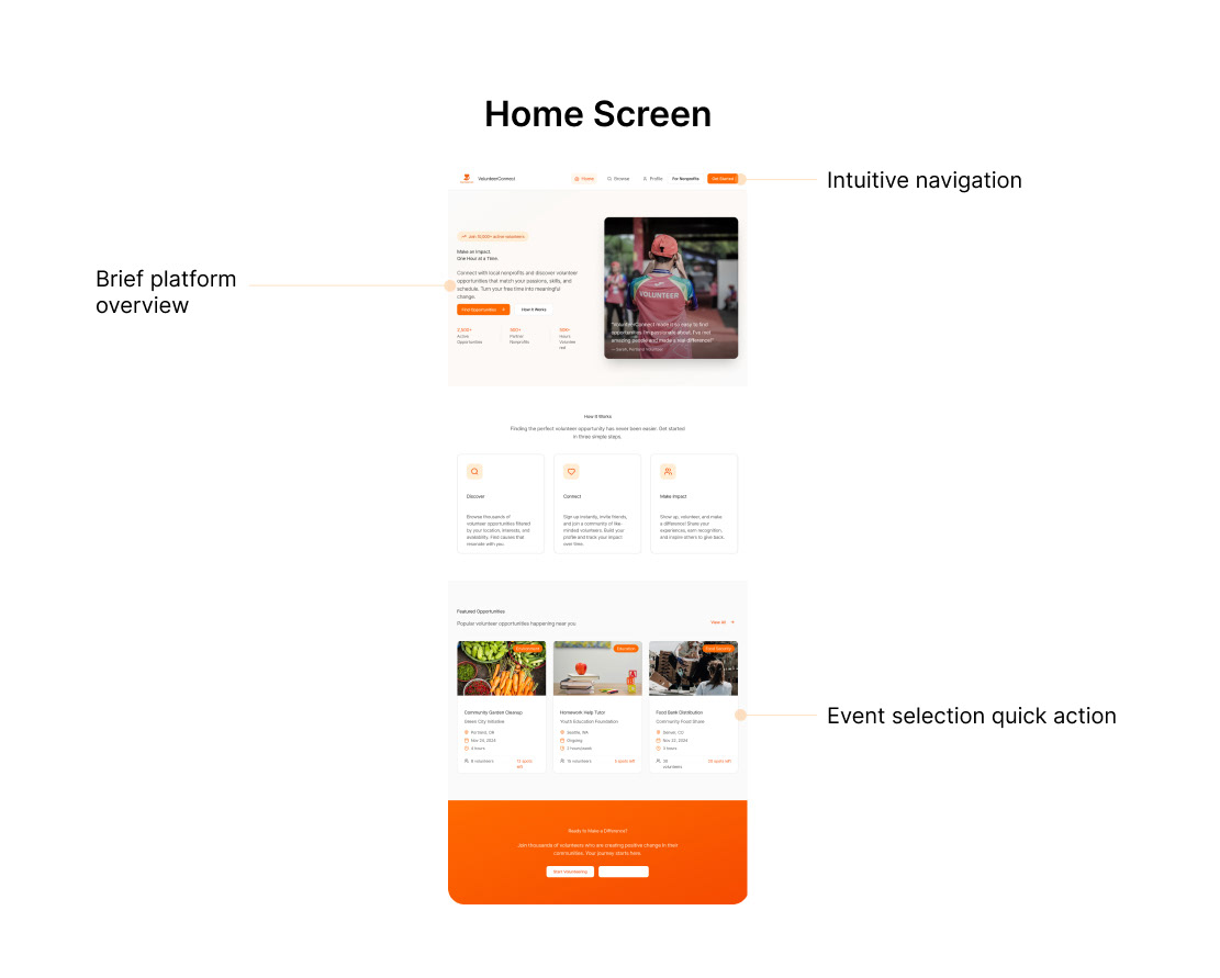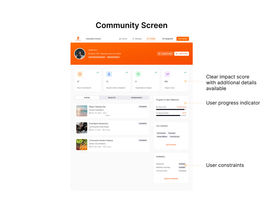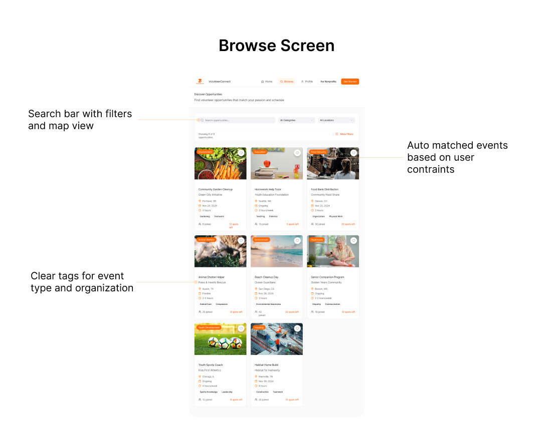 Based on our user research, I created a high‑fidelity Figma prototype that reflects what our volunteers and nonprofits need, built within a familiar and intuitive interface.