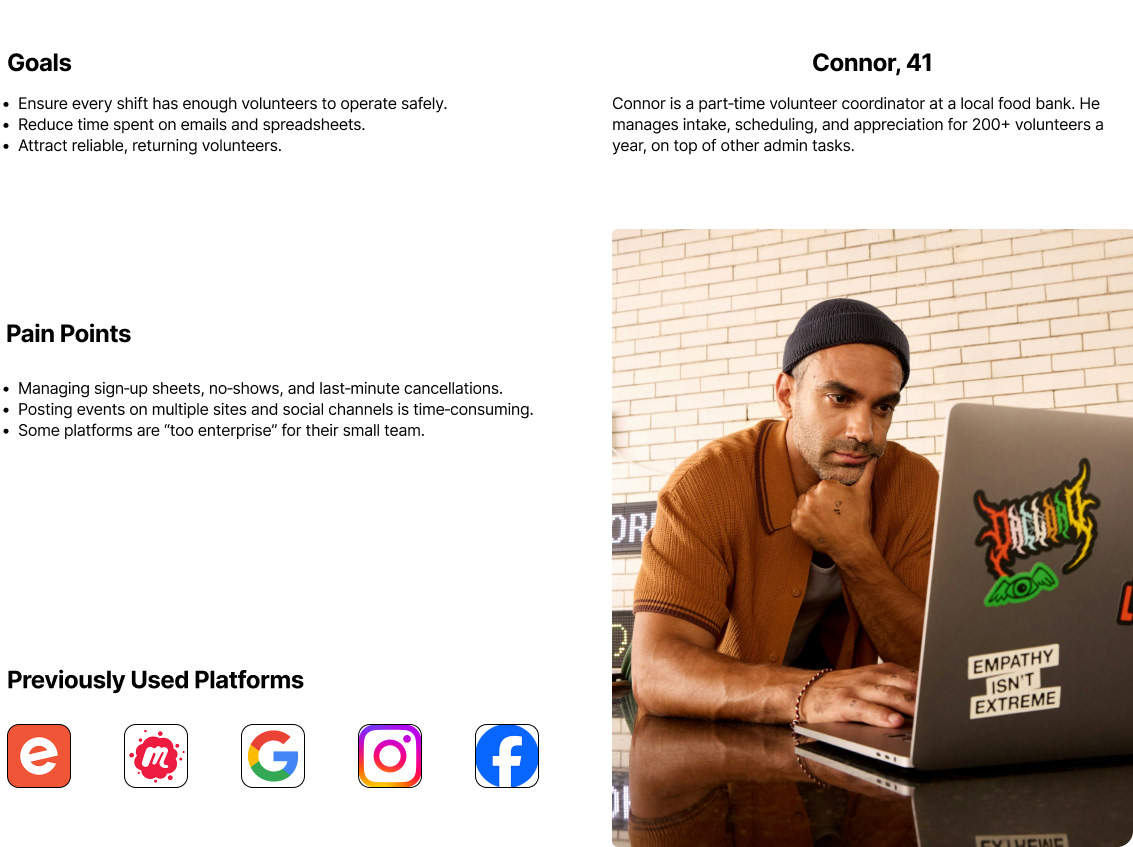3. Community coordinators - Need a fast, lightweight way to post opportunities, recruit, and communicate with volunteers without complex tooling or extra admin work.